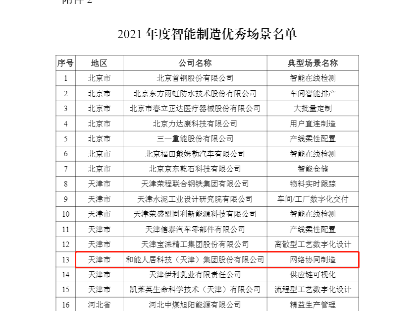 為貫徹落實《“十四五”智能制造發(fā)展規(guī)劃》,經(jīng)省級有關(guān)部門推薦、專家評審、網(wǎng)上公示等程序,工業(yè)和信息化部、國家發(fā)展和改革委員會、財政部、國家市場監(jiān)督管理總局聯(lián)合公布了《2021年度智能制造優(yōu)秀場景名單》,和能人居科技集團網(wǎng)絡(luò)協(xié)同制造榮登榜單。